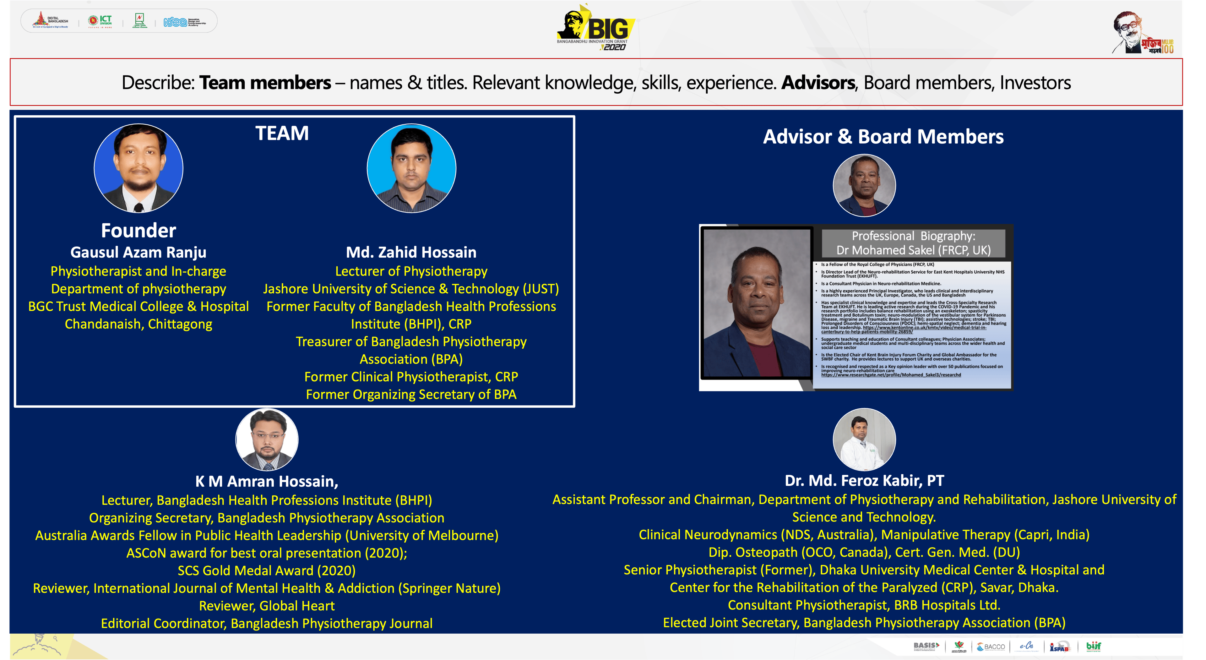 Dr. Gausul Azam (Ranju) conceptualized and proposed “Robo Rehab”—Bangladesh’s first robotic rehabilitation initiative—through the ICT Division’s Bangabandhu Innovation Grant (BIG 2021) under the iDEA Project, marking the country’s earliest formal concept integrating robotics with physiotherapy and rehabilitation. Robo Rehab introduced a visionary model combining robotic rehabilitation, bionics, neurotechnology, and virtual reality to advance physiotherapy into the AI-driven era of intelligent rehabilitation. His continuing mission is to integrate ethical, research-based, and technology-driven solutions to make rehabilitation more inclusive and future-ready.